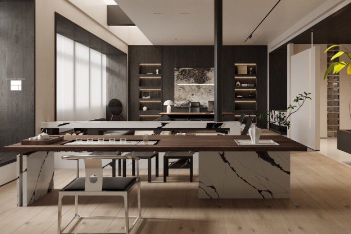 該辦公樓裝修項目總面積達(dá)到3000平,本案從整體設(shè)計來看,恢弘大氣,功能齊全,布局嚴(yán)謹(jǐn);從裝飾主材上看,本案大量使用了大理石飾材,質(zhì)感鮮明,效果突出,給人以高端大氣之感;從風(fēng)格上來講,本案是典型的現(xiàn)代簡約風(fēng)辦公室設(shè)計風(fēng)格,現(xiàn)代氣息濃厚。左圖是進(jìn)門大廳設(shè)計,頂面多邊型發(fā)光軟膜設(shè)計具有時尚設(shè)計感;墻面與地面都是大理石鋪設(shè),...