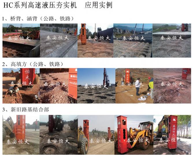 主要用于橋涵背、新舊路基結(jié)合部、高填方等公路、鐵路路基夯實(shí),堤壩及其護(hù)坡夯實(shí),建筑溝槽及回填土夯實(shí),環(huán)衛(wèi)垃圾、有害物質(zhì)填埋夯實(shí)等。用于高速公(鐵)路路基補(bǔ)強(qiáng)時(shí),可使碾壓達(dá)標(biāo)路基繼續(xù)沉降10cm以上。