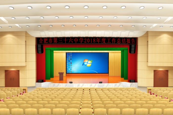 項目名稱:合肥市第三十六中報告廳裝修項目地址:安徽省.合肥市項目概述: 該項目是合肥市第三十六中報告廳設計裝修招標項目,設計要求報告廳容納700人。設計時要考慮到音箱的位置和布線,頂部石膏板階梯吊頂配上射燈。